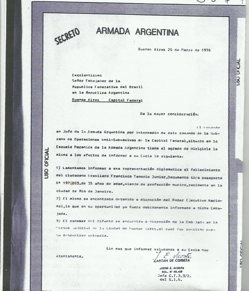 Documento descoberto no arquivo da Escola de Mecânica da Armada, a temível ESMA, comprova que o músico Francisco Tenório Junior morreu sob torturas. Trata-se de um oficio enviado ao embaixador do Brasil na Argentina pelo Capitão de Corveta Jorge Acosta, comunicando a morte do músico nas instalações da ESMA.